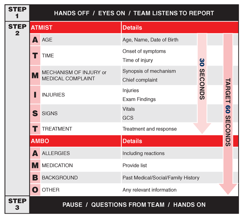 ATMIST AMBO: Used for handover between two care providers and during pre-arrival notification to hospital. See A03: Clinical Handover & Communication for more details.