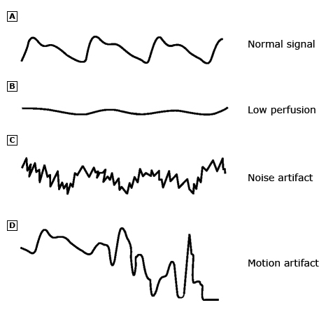 Spo2 Waveform: Only the waveform with the normal signal (A) below is reliable for obtaining oxygen saturation.