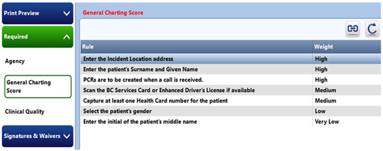 ICARES: There are two components to the scoring system, the first one is General Charting which is non-clinical and applies to all events with a focus on capturing critical data such as patient demographics, billing details and conveyance. The second component is Common Clinical and is applicable to most patient events which align with clinical practice guidelines, as a matter of best practice such as primary surveys, medications, allergies, and vital signs.
