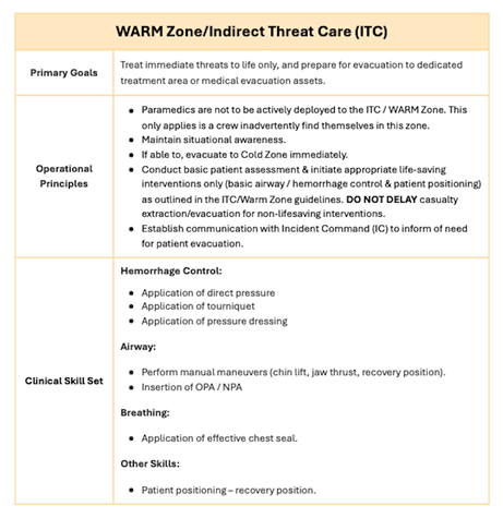 - Phased care based on threat environment — Interventions are structured around Direct Threat, Indirect Threat, and Evacuation phases, rather than rigid zones. The situation will always be dynamic.